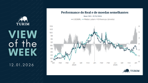 O Real acumulou apreciação superior a 10% em 2025, movimento que contrasta com a desvalorização de mais de 20% registrada no ano anterior. Uma parcela relevante dessa dinâmica esteve associada a fatores externos, refletidos nos movimentos do Dólar global, que exerceram papel determinante sobre o comportamento das moedas emergentes ao longo do ano. Uma forma simplificada de isolar esse componente externo é observar a performance relativa do Real vis-à-vis uma cesta de moedas com características semelhantes, conforme ilustrado no gráfico desta semana.